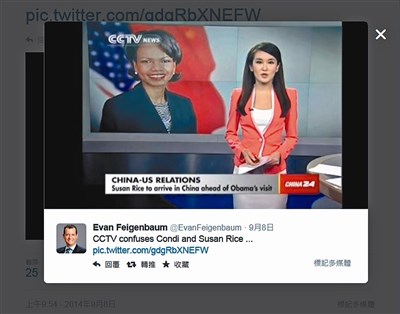 【本報綜合外電報導】美國白宮國家安全顧問萊斯(Susan Rice)近日訪問大陸,但中央電視台英語新聞卻在播報時錯誤使用美國前國卿萊斯(Condoleezza Rice )的照片(見大圖/中央社)。後者也曾在二○○一至二○○五年擔任國安顧問。