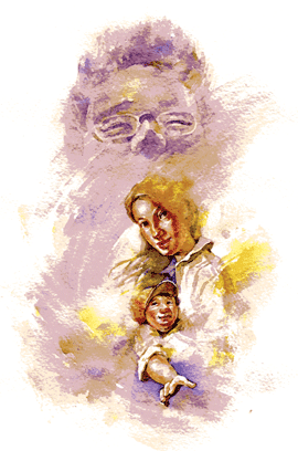 「媽媽想念爸爸。」我低下身子抱著孩子,流著淚。孩子伸出胖胖的小手為我拭淚,安慰著我:「媽媽不要哭!」