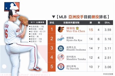 前兩個球季的九月,陳偉殷一勝難求,昨天終於破除九月魔咒,他特別感謝隊友火力支援,「讓我可以專注在投球上」。 殷仔本季先發二十八場,戰績十五勝四敗,是目前大聯盟勝投最多的亞洲投手,水手岩隈久志、道奇柳賢振以十四勝緊追在後。