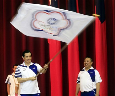 總統馬英九(左)今為「第17屆仁川亞洲運動會」中華台北代表團授旗。圖/中央社