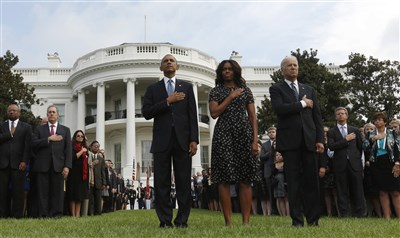 歐巴馬與第一夫人米雪兒、副總統白登夫婦11日帶領眾人在白宮南草坪的悼念儀式上默哀,依照慣例演奏〈安息號〉(Taps)追思罹難者。他隨後到國防部參加在此罹難的184人的紀念儀式,他致辭時說,恐怖分子低估美國的耐力,就算摧毀美國地標建築,也絕對無法擊垮美國精神,「我們挺了下來,因為美國人不會屈服於恐懼,永遠不會。」