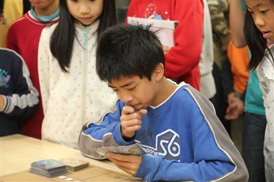 一個月一次卡片國王大賽,學生拿出辛苦收集的omi卡,認真思索攻擊策略,打敗對手。圖/劉秦瑋提供