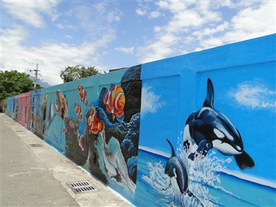 「我畫的最大幅油畫長達300公尺,就位於國軍花蓮總醫院後方圍牆。」新城鄉依山傍海,他以海洋世界與自然生態為主軸,彩繪出鯨豚、花鳥等內容。