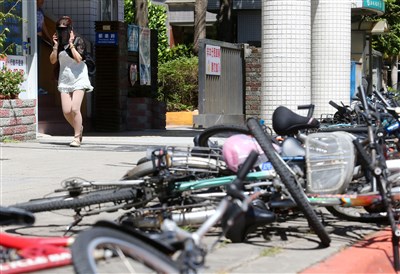 根據中央氣象局觀測,北台灣街頭刮起陣陣強風,來往行人舉步維艱,連原本停在路旁的腳踏車也不敵強風,倒成一片。圖/王騰毅