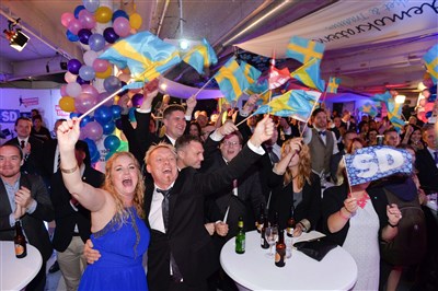 瑞典國會大選,社民黨勒夫文率領的左傾紅綠聯盟險勝,支持者興奮的開趴慶祝。圖/路透