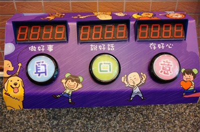 南華大學「三好燈」包括做好事、說好話、存好心,學生認為達到目標,就能按下按鈕。圖/林伯驊