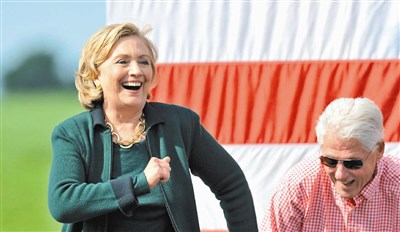 希拉蕊(上圖左/法新社)和夫婿柯林頓前總統十四日聯袂到訪愛州,名義上是出席愛州老牌國會參議員哈金的鄉村烤牛排募款活動,並為期中選舉的民主黨候選人打氣,但她並不隱瞞為再次競選總統鋪路的打算。