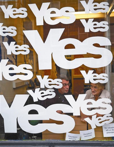 分手吧 圖為蘇格蘭當地馬瑟爾堡一家商店的櫥窗上,十五日貼滿了支持獨立的「是」字標語。圖/路透