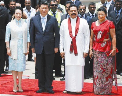 中國國家主席習近平(左二)和夫人彭麗媛,於十六日中午抵達斯里蘭卡首都可倫坡,展開國是訪問;斯里蘭卡總統與夫人在機場親迎。圖/路透