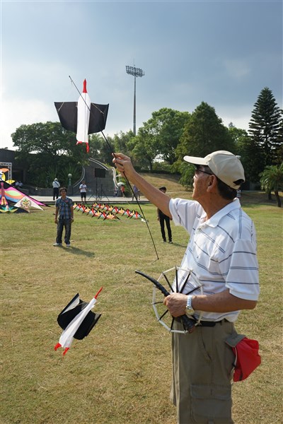 風箏達人「閻老」設計的作品企鵝,成雙成對的在空中自由飛行,就像他與他的女友的人生一樣。圖/周毓翔