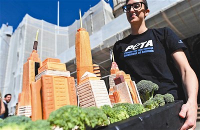 【本報綜合外電報導】善待動物組織(PETA)十七日宣布,紐約為全球「素食者最友善城市」;為此,蘇格蘭演員艾倫康明帶來一座用蔬菜精雕細琢而成的「曼哈頓天際線」(見圖/法新社)。