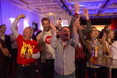 一群反對獨立的擁護者19日上午在愛丁堡的一家飯店內,為剛開出的初步結果歡呼。圖/美聯社