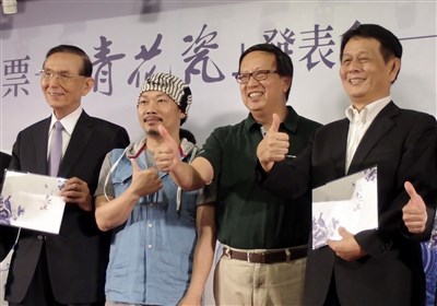 中華郵政推出青花瓷古物郵票拍賣,董事長翁文祺(右2)邀作詞人方文山(左2)代言。圖/蘇瑋璇