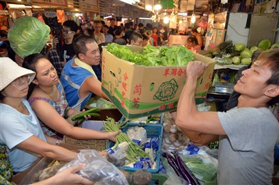 怕颱風來菜價又漲,民眾一早到傳統市場趕買蔬果,老闆樂得一箱箱扛出來賣。不過消費者認為漲得沒道理,主管單位應管管。