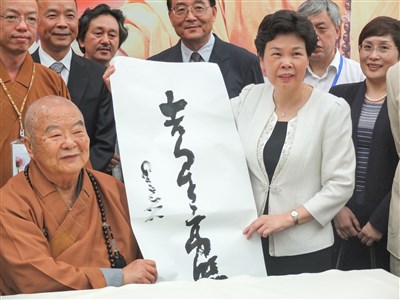星雲大師現場揮毫,贈送浙江領導葛慧君。圖/特約記者符芝瑛