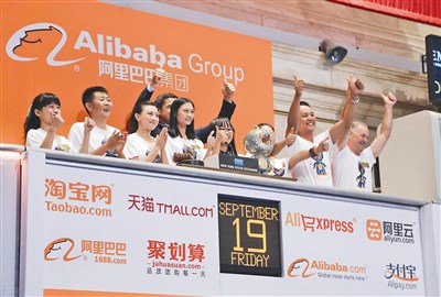 市場代號「BABA」的阿里巴巴,十八日敲定的上市價格為六十八美元,開盤價就漲到九十二點七美元,一小時內漲到接近一百美元,最後以九十三點八九美元收盤,漲幅超過百分之三十八。銀行和避險基金等一些機構投資者得以用六十八美元股價購入,可是大部分其他投資者必須等股票公開交易展開才能進場。阿里巴巴的淘寶、天貓和其他交易平台,控制了中國電商的大約八成市場,它有兩億七千九百萬活躍用戶。