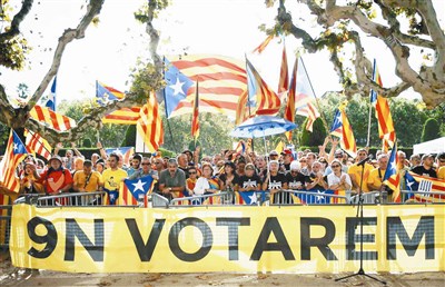 蘇獨公投失敗,西班牙加泰隆尼亞自治區爭取獨立不氣餒,圖為群眾在議會廣場,揮舞獨立運動的象徵旗幟。圖/路透
