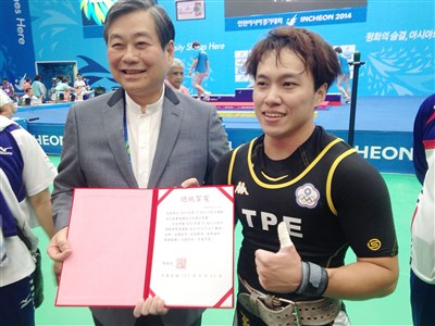 中華舉重女將林子琦(右)今天為中華代表隊拿下一面金牌,賽後她開心秀出總統賀電。圖/中央社