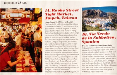 《寂寞星球》德國版請編輯記者群推薦心目中最佳私房景點,票選出值得一遊的全球18個秘境地點,其中,北亞洲區編輯伊弗斯(Megan Eaves)特別推薦台灣的夜市美食。