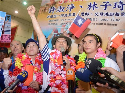 亞運中華舉重代表隊下午返台,機場擠滿歡迎的鄉親,在2位奪金弟子許淑淨(右)、林子琦(左2)陪伴下,教練蔡溫義(右2)高興地高呼「台灣之光」。圖/中央社