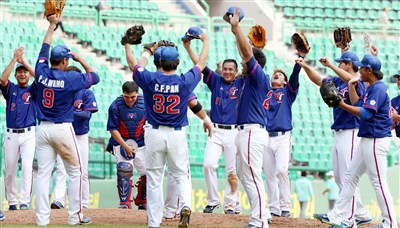 亞運棒球賽中華隊今天在準決賽中,以10:4力克日本隊闖進金牌戰,賽後球員興奮地在場中高舉雙臂慶賀。圖/侯永全