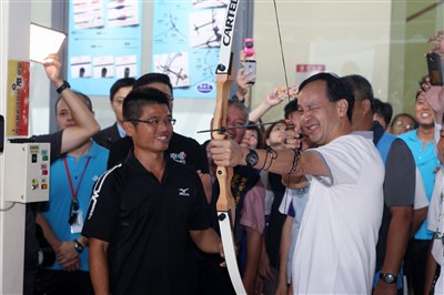 新北市長朱立倫上午參加啟用典禮,在陳詩園指導下體驗射箭,朱立倫連發3箭都未射中靶中的汽球,直至第4箭才射中,眾人也鬆了口氣,笑了出來。