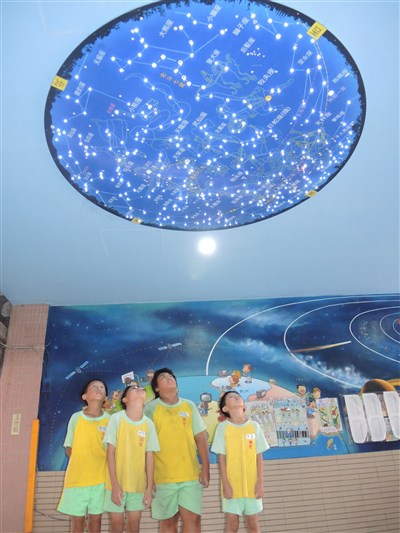王惠萱說,自然領域在穿堂天花板上布置4個星象,更有燈泡當作星星點綴,孩子們下課最愛在天花板下方仰望星星,比起上課教學,下課後的輔助反而讓孩子更有興趣。