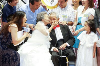 【本報台北訊】101歲的林進廷今天獻上超大求婚戒指模型,給95歲老婆陳秀奎,感謝老婆近70年的陪伴與照顧,阿嬤以一吻回報,夫妻倆上午登台走秀,讓眾人見證老人的活力。他說,結婚那麼久,叫他說「我愛妳」,他說不出口,但夫妻沒有愛,怎麼能在一起那麼久。