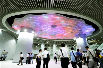 台北捷運松山線上午初勘,台北市交通局相關單位人員與學者前往松山等站,分組勘查現場營運動線及機電設備,松山站大廳頂部的公共藝術品「河流彎曲處、域見繁花光穹」頗為吸睛。圖/屠惠剛