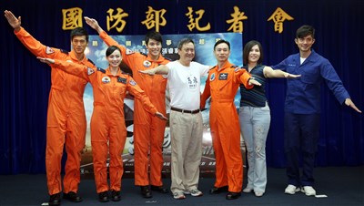 國防部今天召開支援拍攝電影《想飛》記者會,導演李崗(中)、男主角張睿家(左三)、演員姚以緹(左二)等人出席記者會,故事藍本真實主角中校軍官夫妻李政亮(右三)、楊雅惠(右二)現身說明。圖/曾吉松