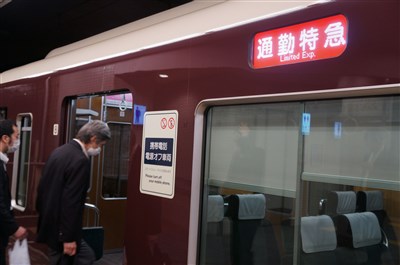 京都往大阪的阪急電鐵的「通勤特急」上特別有一節車廂標明必須將手機關機,搭乘的旅客只能用手機上網,不能在車廂中講電話。圖/嚴文廷