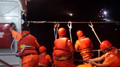 海巡隊艦艇昨晚駛近在澎湖外海擱淺的海研5號,由於海象惡劣,在甲板上施救的隊員都必須繫上固定繩,避免落海。圖/海岸巡防署提供