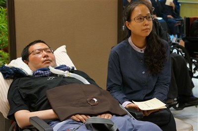 【人間社記者陳秋玉台北報導】陳宏遺孀劉學慧及媳婦KiKi陪同漸凍人次子陳大謀,前來佛光山台北道場受持五戒,兩名看護同時也皈依。陳大謀說,「他很高興到台北道場受五戒是很好的機緣,人生難得佛法難聞,能夠聽聞到佛光山開山星雲大師的開示真是三生有幸。」