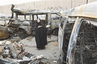 伊拉克首都巴格達舒拉區遭汽車炸彈攻擊,一名婦人指著被炸毀的車輛,似乎餘悸猶存。圖/路透