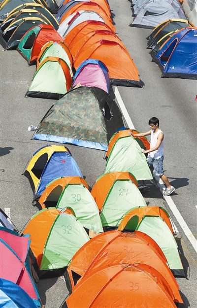 占中民眾昨天將約兩百頂帳篷搭在通往中環的告羅士打路和夏愨道上。圖/路透