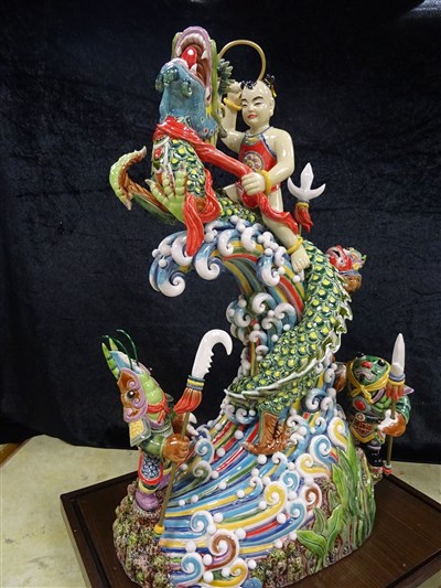 吳威德的作品〈哪吒鬧東海〉,獲得第13屆「葉王獎」交趾陶全國創作競賽的經典工藝組特優。圖/嘉義市文化局提供