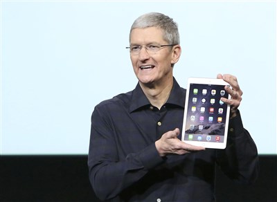 蘋果公司16日在加州總部舉行iPad新品發布會,包括iPad Air 2、iPad Mini 3、新款iMac電腦和Mac Mini微型主機也一起亮相。圖為公司執行長庫克展示iPad Air 2。圖/路透
