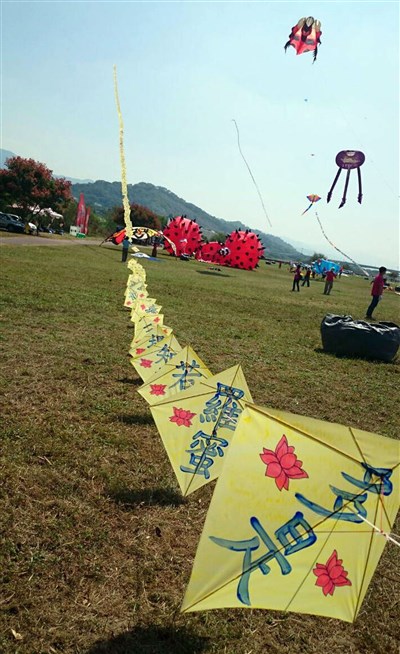 苗栗風箏節今天在苗栗市河濱公園登場,特製的「心經風箏」,將260個字的《心經》,每2個字1節,共130節,配上2朵蓮花圖樣的造型風箏放飛,為台灣食安祈福。圖/中央社