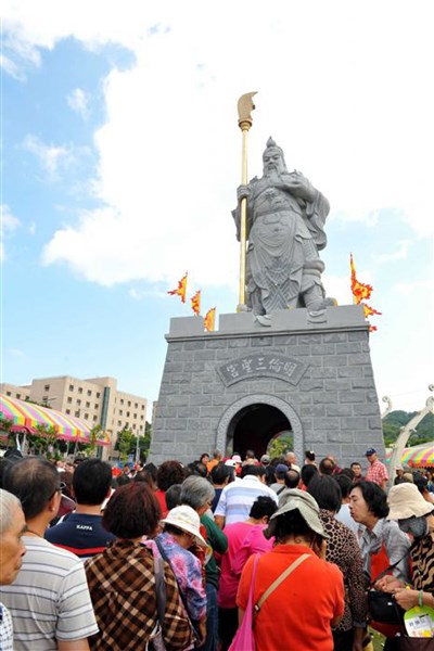 【本報桃園訊】位於桃園市虎頭山上的明倫三聖宮,斥資千萬在入口處打造全國最高的關公立像,廟方今天舉行安座典禮及剪綵活動,吸引數千名民眾到場觀禮。