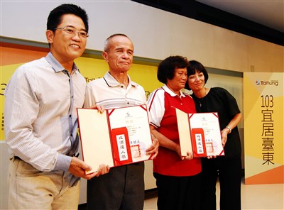 嗜酒長達60年的退休老師陳榮生(左2),因孫子一句話「酒鬼阿公又來了」相當難過,鼓起勇氣戒酒195天,獲台東縣府表揚。圖/中央社