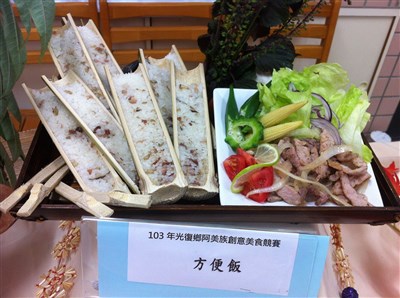 光復鄉衛生所林春孝表示,月桃葉、山苦瓜、馬告、紫糯米、藤心都是光復特有天然食材,以「少油、少鹽、少糖及高纖」健康飲食概念為主軸,今年特別加入健康食材之衛生及總熱量概念,期許在食安風暴下,提高民眾食材選用及料理技能,三餐能「食」在安心。
