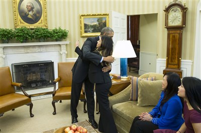 染伊波拉護士范妮娜24日痊癒出院,在媽媽、姊姊的陪伴下,她回家前造訪白宮,美國總統歐巴馬在辦公室給她大擁抱,表達對前線醫護人員的支持。圖/美聯社