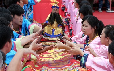 台北客家義民嘉年華今天舉行安座大典,信眾們接力恭迎各地義民廟的神座。圖/潘俊宏