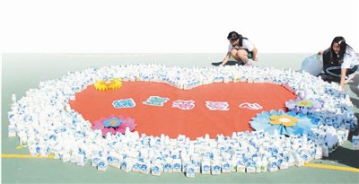 【記者林汝娟台北報導】台北市仁愛國小昨天響應全國能源教育周,集合全校二千多名學生喝的牛奶紙盒、空瓶,發起「罐蓋滿愛心,仁人愛地球」體驗活動(圖/記者林汝娟),在操場用洗淨的牛奶盒排成愛心,並透過縮時錄影記錄,讓學生明白愛護地球的重要。
