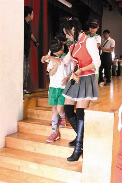 昨天小朋友首先體驗視障者行走,他們戴著眼罩移動,結果熟悉環境頓時變成陌生路程,直呼:「很沒安全感!」