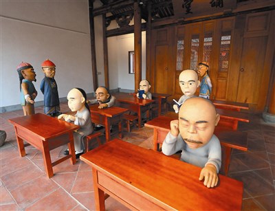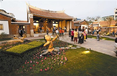 民眾走進鳳儀書院刻意塑造的歷史場景,「這些尪仔足古椎咧!」Q版公仔讓大人、小孩都喜歡,猛按快門。