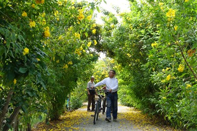 富州社區10年前在農委會水保局協助下,建構全長800公尺的隆恩圳自行車道,同步種植上千株黃鐘花,經自然淘汰後僅剩3百多株,在志工隊細心照料下,花況逐年變好,不少居民都會到這條「黃金走廊」遊玩。