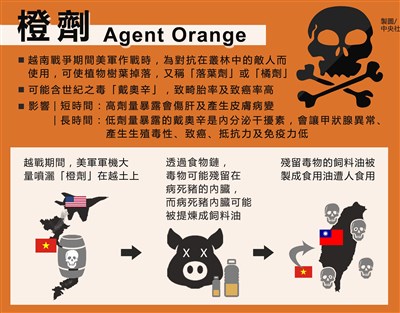 毒物專家指出,橙劑中可能含世紀之毒戴奧辛,致畸胎率及致癌率高,易殘留在動物脂肪,經食物鏈被人吃入,建議嚴格把關並多採樣檢驗,越南進口食品也應加強檢驗。表/中央社