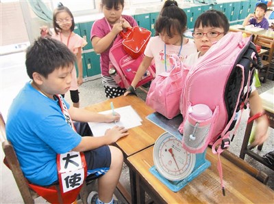 學校推派書包減重大使,不定時到各班宣傳「書包輕一些、健康多一點」等口號,並隨機檢測學生書包重量。