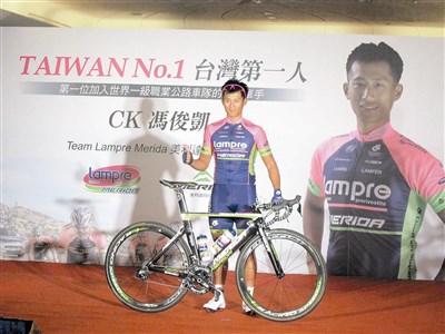 他十月和「美利達‧藍波」車隊正式簽約,昨天宣布記者會上先以帥氣西裝亮相,隨後就換上新車衣,和市價三十五萬台幣的戰駒銳克多一同亮相。